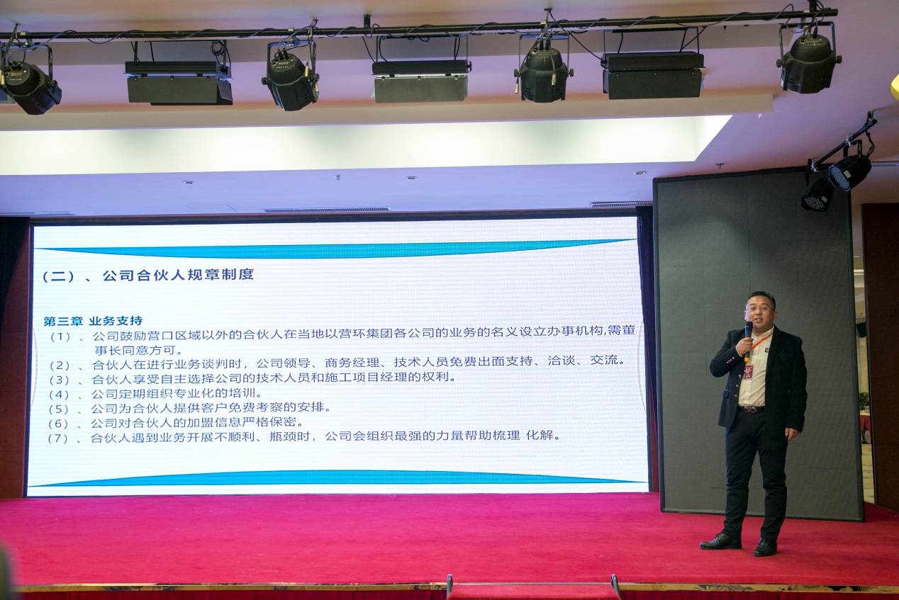 營口市環(huán)境工程開發(fā)有限公司賈喜東商務(wù)副總做《如何輕松達到事業(yè)另一個頂峰》報告,報告中就如何尋找項目、如何提高項目成功率及如何跟蹤已簽約項目、讓老客戶再次購買和轉(zhuǎn)介紹,進行分析講解。